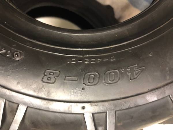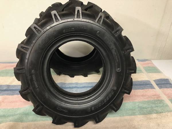 I purchased this pair of Deestone 4 ply D402 4.00-8 tubeless ag tread tires for my old Troy Bilt tiller and never ended up using them. They have been in a box in my shop for many years. These are currently selling for $45.00 and up each online. I am offering the pair for a very reasonable price due to their age.