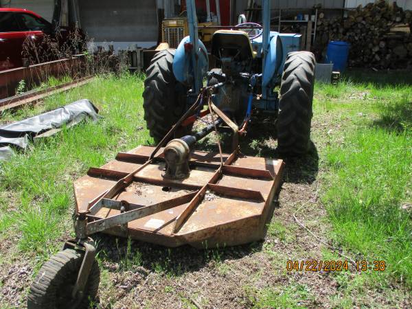 3 Cyl Diesel Ford Farm Tractor. Has new Battery ($200.00). Has extra large air filter ( was used to broom streets). All 3 PT hitch components are new. Hydraulic pump for the hitch is new. New drive shaft. Brush hog has only been used 6 or 8 times. It was bought new and stored under a section of rubber for 15 years. (thus the old abused look). 5spd w/ high & Low. The guages need wired. I made an adapter plate to move the seat rearward for more leg room. Tractor starts and runs well. #1 injector just rebuilt. I bought a zero turn because the acreage required too much backing up to use this tractor. OPEN TO REASONABLE OFFERS. New repair manual included.