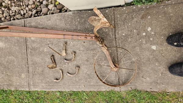 The vintage Planet Jr hand plow with a 14 inch steel wheel is an antique piece perfect for a garden or architectural setting. This hand plow is a charming addition to any outdoor space, adding a touch of vintage style and historical authenticity. The durable steel wheel ensures efficient and effective use, while the compact size makes it easy to maneuver in various gardening tasks. Ideal for those looking to add a unique and authentic touch to their garden or landscaping design.