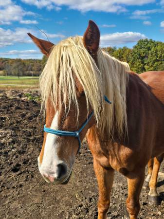 4 year old Halflinger Belgian cross mare. About 15 hands. I bought her at 9 months old. Was started driving by an Amish friend, but due to my laziness she would likely need restarted. She is a very nice calm horse. Easy to lead, very friendly with people. Loads great. Stands good for the farrier. Has road shoes on now. Only reason for selling is I found an older one, and don't have the space for 3. No fault of hers, as I said, she is very nice and I am very lazy... she is very flashy and beautiful in the summer. I can deliver if needed within a reasonable distance.