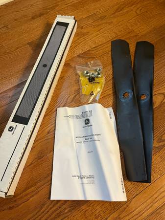 Brand New. Still in box. John Deere Blade Installation Kit. Comes with 2 blades, lock nuts and installation manual.