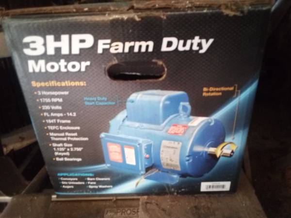 3 HP 230 volts 1755 RPM Heavy duty start capacitor, 14.2 amps, bi directional rotation. These sell for over $900 at tractor supply. Works as it should. No problems. Has a long electrical cord. Also...