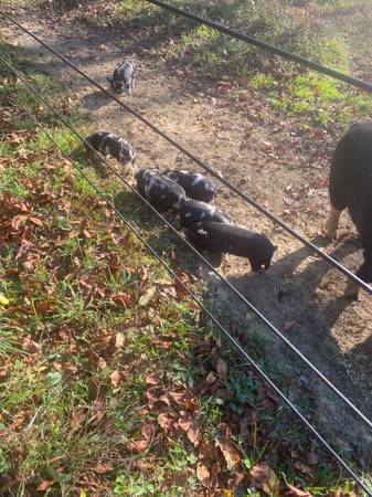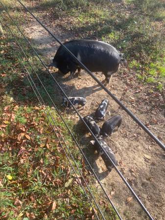 1.5 yr old kune sow and 6 piglets. Piglets are 2 weeks old. This is her first litter, and she didn’t lose any. She has been a great mother. Piglets are 3 girls and 3 boys. Sow respects electric...