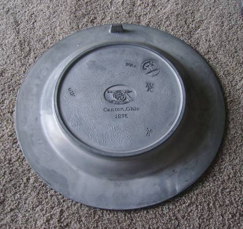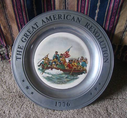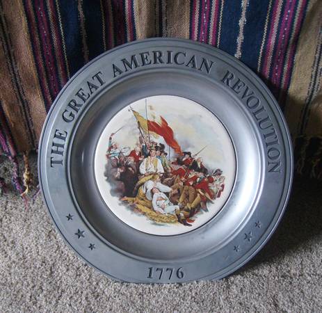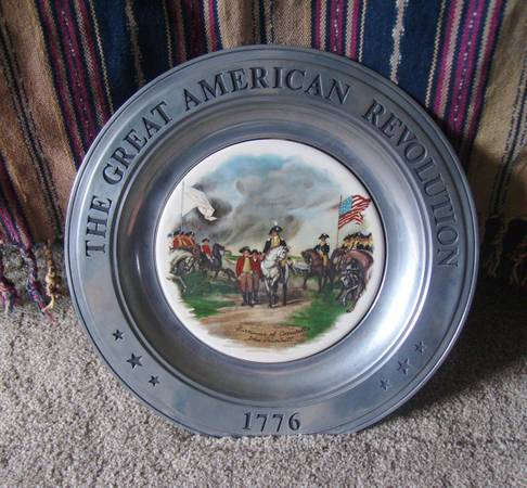 Set of 6 decorative pewter plates featuring scenes from the American Revolution. Made by Williamsport Foundry in 1975. Porcelain inserts painted by Emanuel Leutze. Plates measure 10.5" diameter....