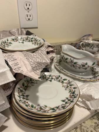 I have a complete set of china - that's a setting of 12 All the serving dishes including platter and teapot, gravy boat, sugar and creamer etc. Dogwood pattern King court china Carolina Made in Japan