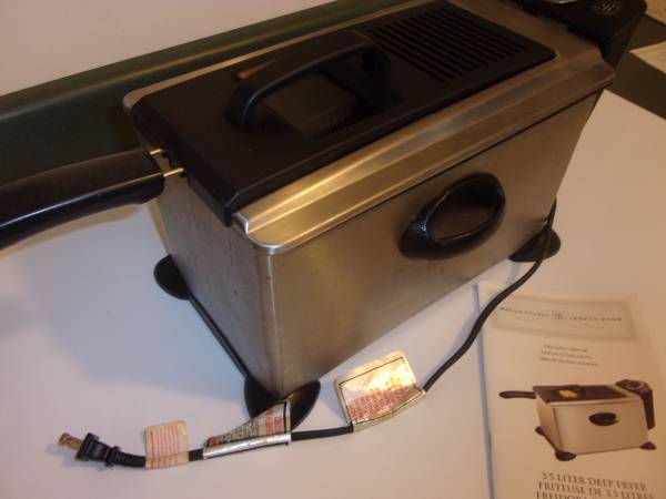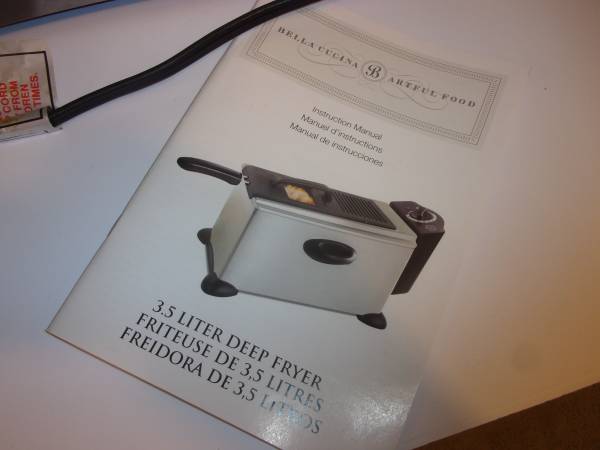 DEEP FRYER, HIGH QUALITY BELLA CUCINA, 3.5 LITER DEEP, FRYER INCLUDES ORGINAL INSTRUCTION MANUAL 21 INCHES TOTAL LENGTHG X 9 HIGH MAIN POT 13 X 7 X 8 HIGH