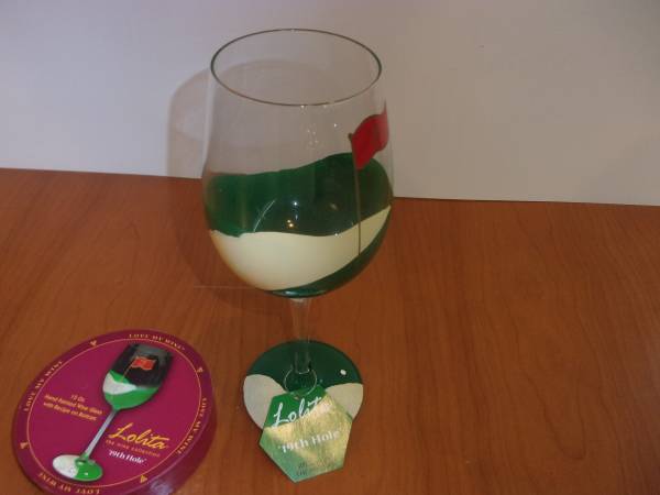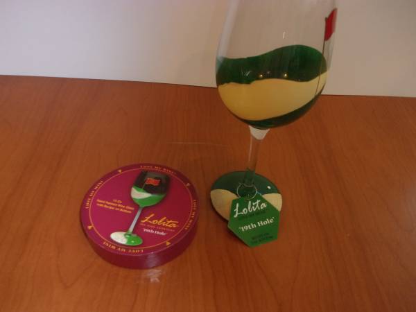 LOLITA the WINE COLLECTION, COLLECTOR GLASS, "19 HOLE" NEW IN BOX WITH CHISTMAS GIFT BAG 15 OZ PART OF A LONG SERIES OF COLLECTOR GLASSES (see box picture)