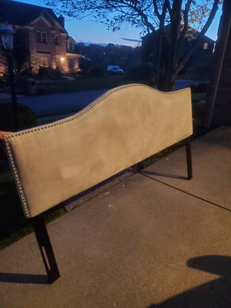 Modern style headboard with brass riveted edge and suede feel fabric. Includes adjustible metal box spring bed frame. Like new. Cash only.