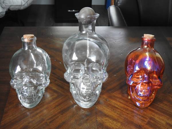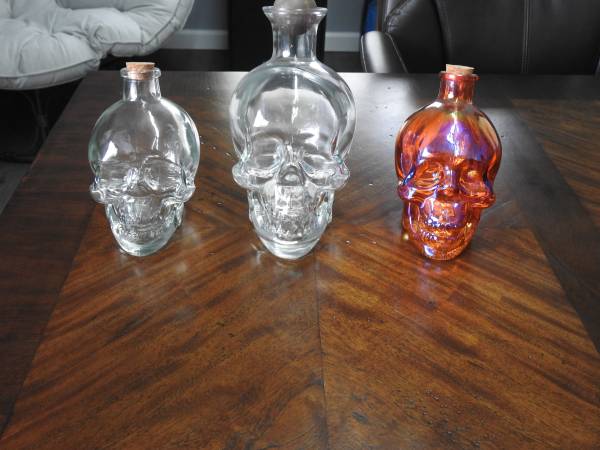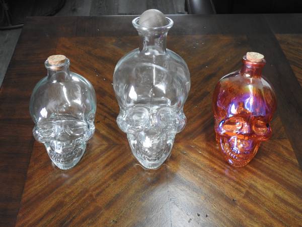 Three Glass Skulls Decanter/Decor. New Condition, never had anything poured into them. I will not respond to texts.