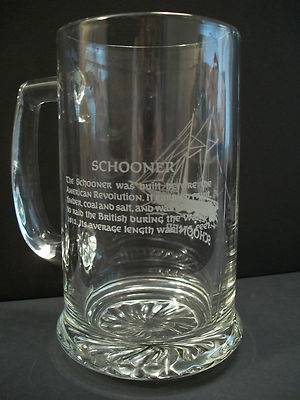 An etched ship is on one side of the clear glass mug with descriptions and historical facts on the opposite side.