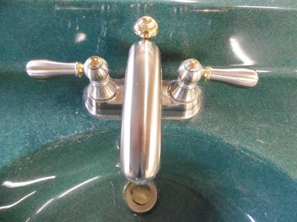 Bathroom Counter top with faucet in emerald green, does have a chip on the right hand corner. The chip is shown in the pictures. The counter top is approximately 49 x 21 1/2 inches. Pick up only in...