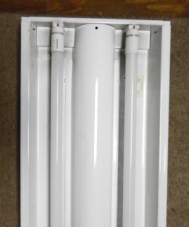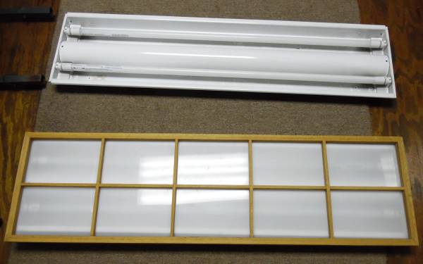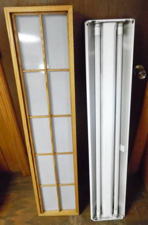 4 ft Decorative Fluorescent Light. The picture shows the cover is wood with a plastic shade. The plastic shade has a small crack that was repaired, as shown in pictures, All are in good working...