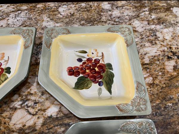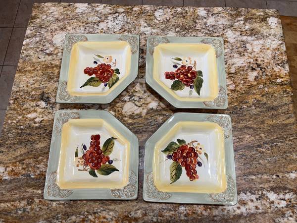 Beautiful Tuscan look with grape motif in the center of the bowls.