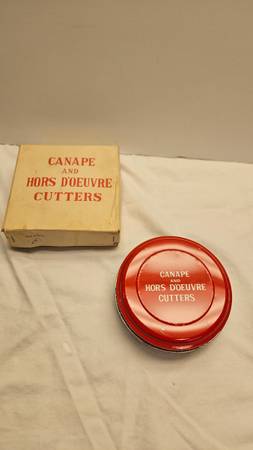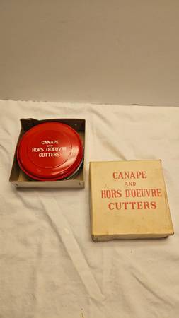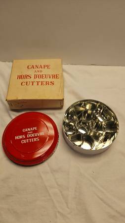 12 Vintage Canape and Hors Doeuvre Cutters. They are in the original tin and original box. Made in Japan. The tin is approx. 4.75" diameter X 1.5" tall. Small scapes on top of tin. Excellent vintage...