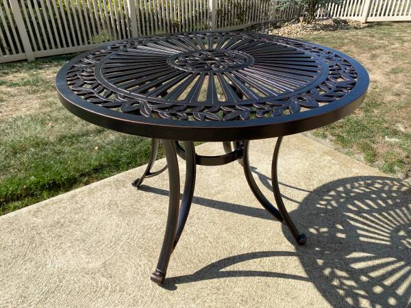 Brand New…Never used Mildew & rust resistant Black powder Black powder coated with hand applied antiqued highlights Umbrella Umbrella hole in table top