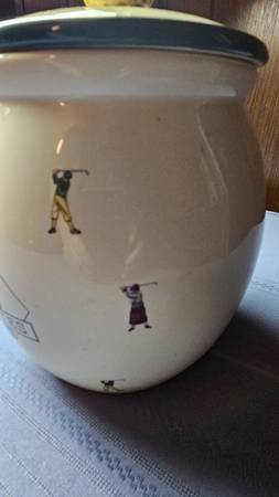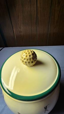 Adorable Golf Cookie Jar. Featuring a golf ball topped lid and vintage golfers. Approx. 7" wide at widest point. Mouth is 6" wide. 9.5" tall to top of golf ball. Excellent condition.