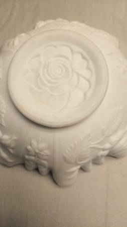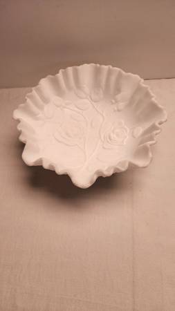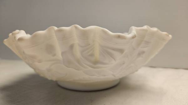 Beautiful Fenton? Milk Glass Bowl with Ruffled Edge and Rose Pattern. Approx. 9" in diameter X 3" tall. Excellent condition. Ask about my other milk glass pieces.