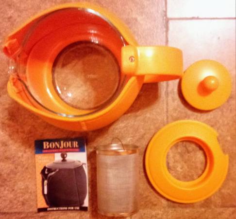 If you're seeing this listing, then this is still available. I won't respond to "Is this available?" Bonjour Prosperity 5 cup teapot with jacket $10. Cash only, no digital payments.