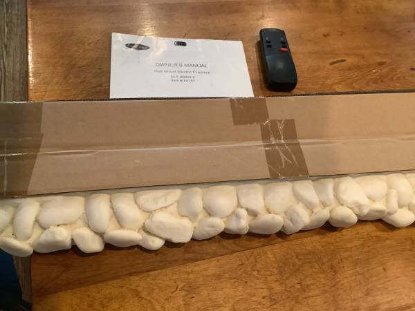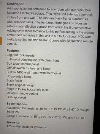 Wall mount electric fireplace heater. Plugs into standard outlet. Includes remote control, owners manual, and two log options.