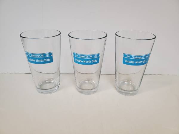 This listing is for 3 Imbibe North Side Beer Bar Glasses. They are in excellent pre-owned condition.