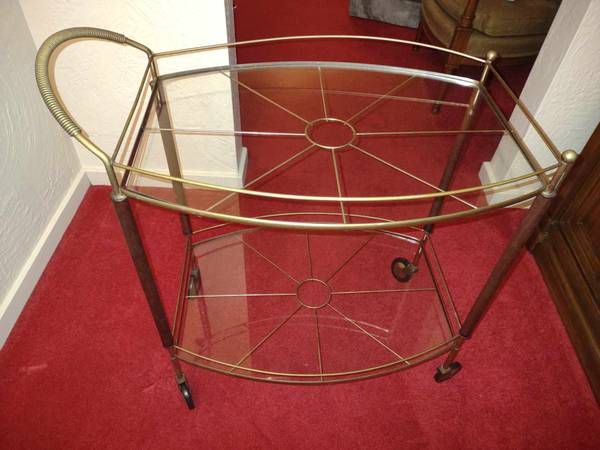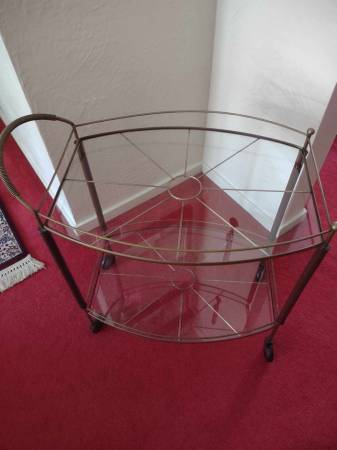 Mid-Century Modern Movable Tea Cart ...can be used decoratively to display glassware, can be used to serve drinks, etc, can be used for houseplants. Many, many uses. Metal can be shined or painted. Glass is in good shape. Very hard to find and unusual item.