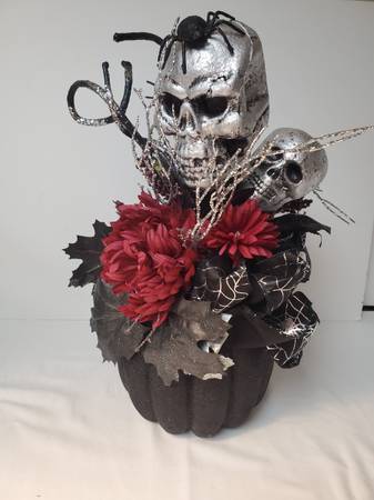 New Halloween Centerpiece. A black pumpkin adorned with skulls and spiderweb ribbon. It is approx. 10" wide X 18" tall.