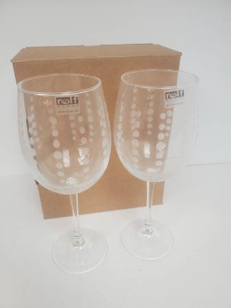 2 New White Etched Rolf Polka Dot Wine Glasses. They were used as a gift at a retirement parts. They are in their original new box. The boxes have a sticker on them, that can be removed, but it leaves a mark on the box. Each glass is approx. 3" diameter at the top and 9" tall. I have 17 boxes of 2. Each box of 2 is $20.00. Discount if you purchase all 17 boxes.