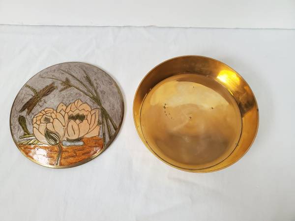 Ornate Brass Dragonfly Trinket Dish with Lid. Approx. 5.5" diameter X 2" tall. Few marks inside. I think they might come off with brass cleaner?