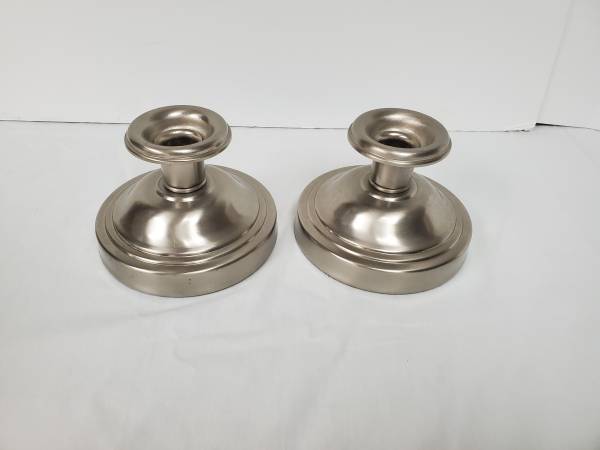 2 Pewter Taper Candle Holders. Each is approx. 5" diameter on the bottom X 3.5" tall. Felt on the bottom. Excellent condition.