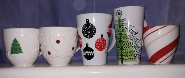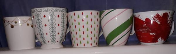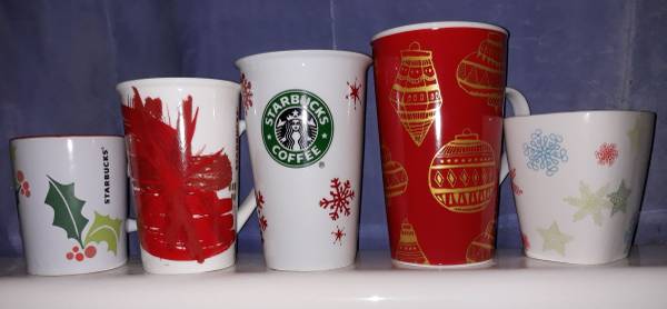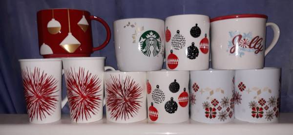 Various styles and vintages of Starbucks holiday cups and mugs. $15 each. 12202024