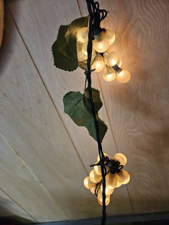 4 Strands of Vintage Grape Party Lights. Each approx. 7 ft long. They plug into each other. On one strand 4 bunches are out, but you can insert a new bulb. One strand has leaves, but you can hot glue leaves to the other strands. Some leaves that fell off are included. These are vintage and have a vintage patina. They look very nice lit up. Great for your wine party.