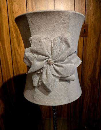 If you are reading this, Yes, it is still available. Great for a girls dorm room or a girls bedroom. The white band around the middle of the white shade has sparkles on it that looks like rhinestones, but their not, and small faux pearls in the middle. (Look closely at the picture). Selling for $20.00. It's in good condition. Has a very beautiful shade on it. (Check out the picture, it is not just a plain shade). Works fine. Original owner. It comes from a smoke free home.