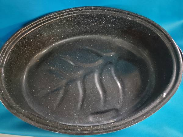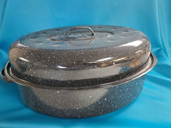 This listing is for a vintage black speckled Enamelware Roasting Pan with Lid. It is approx. 16.5"X12"X4.25" deep (with lid on it is approx 7.5" tall). It is in great pre-owned condition.