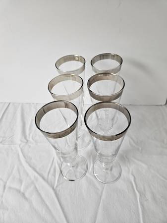 6 Vintage Mid Mod Champagne Flutes with Silver Band. Approx. 3" wide at the top X 8.5" tall. One silver band has some scuffing and one has a mark on the bottom that seems to be coming off....