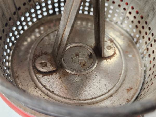 Vintage Rolling Pin and Masher Ricer. The rolling pin is approx. 2" diameter X 9.75" long. It is approx. 17.5" handle to handle. It has the vintage red handles. The masher/ricer is red and approx. 3.5" wide X 10.5" long. Both have minor scuffing due to age. Great vintage condition.