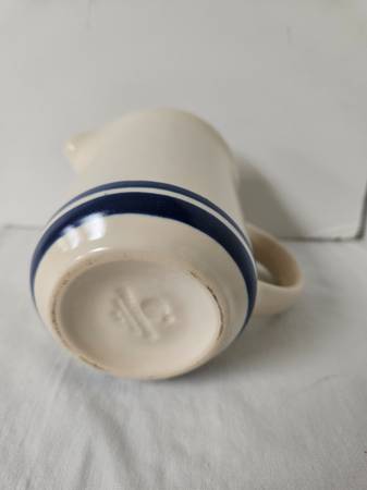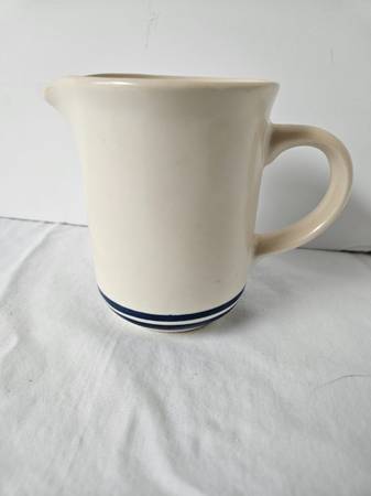 White Creamer with Blue Stripe. I cannot read the hallmark on the bottom. Could be Pfalzgraff? Excellent condition.