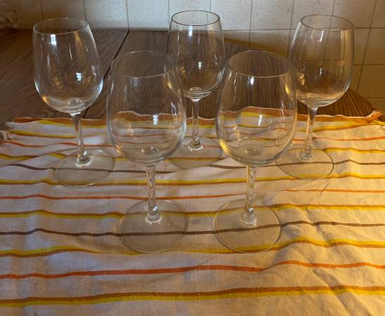 There are five wine glasses with a normal stem on the bottom of the glass and eight inches high. This could be used to drink wine, water, and soda.