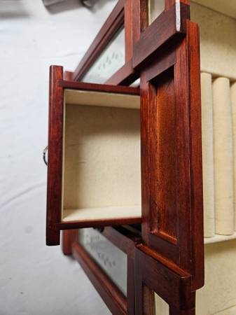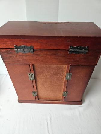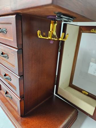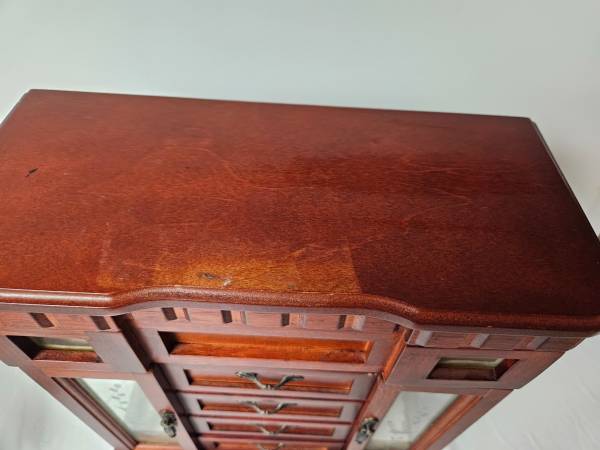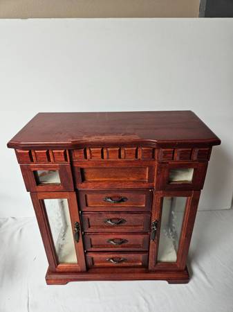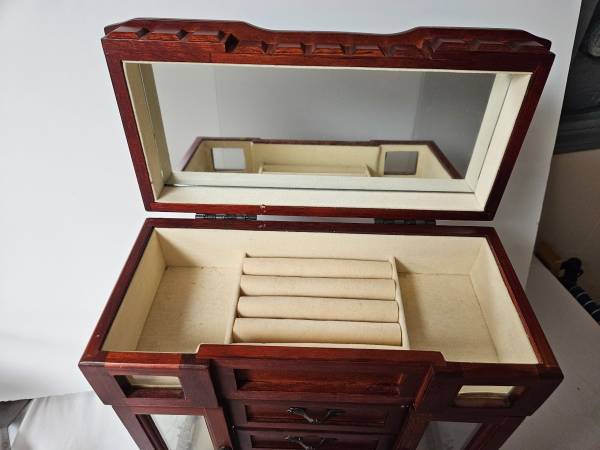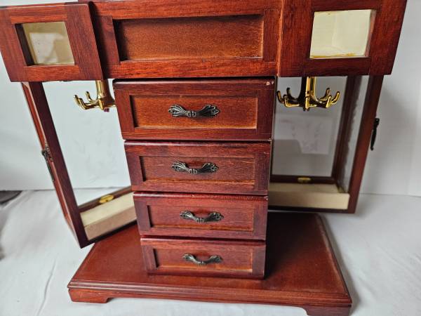 Wood Jewelry Box. Approx. 12"X5.5"X13" tall. Both sides open to hang necklaces. It has 4 drawers. The top opens to reveal a mirror and ring compartment. The top has fading and scuffing. It is in good condition except for the top. I would suggest putting a small doily on top with a few trinkets.
