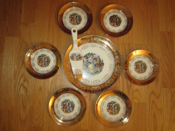 Antique Cake Plate with Serving knife with six Dessert plates $100.00 14kt Gold Overlay Please call Jason at Leave a message if no answer. No emails or texts messages please. Posting will be removed...