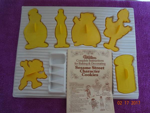 Complete set of six Sesame Street Cookie Cutters in original box with decorating instructions. Manufactured by Wilton circa 1980. Used once. Box is faded, but in good condition. No bag or tips.