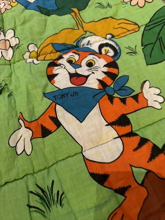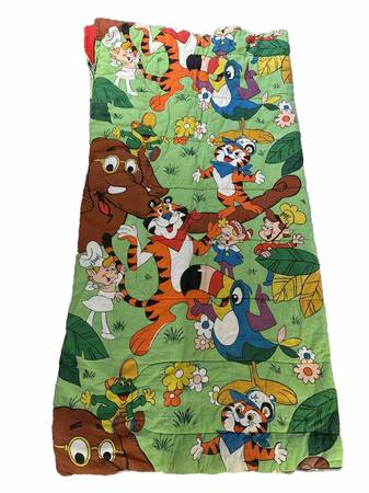 Vintage 1970's Kellogg's Brands Sleeping Bag. Made of a cotton/synthetic blend. Features the Kellogg's cereal brands and their mascots: Tony the Tiger, Snap, Crackle and Pop and Toucan Sam. I have...