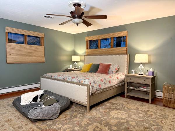 There are no visible stains; however, you can see on the backing that one of our dogs peed near the corner. It has been cleaned, but you may want to clean it again.