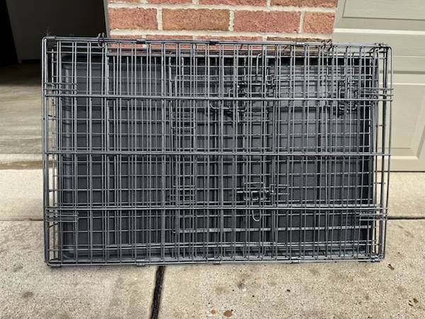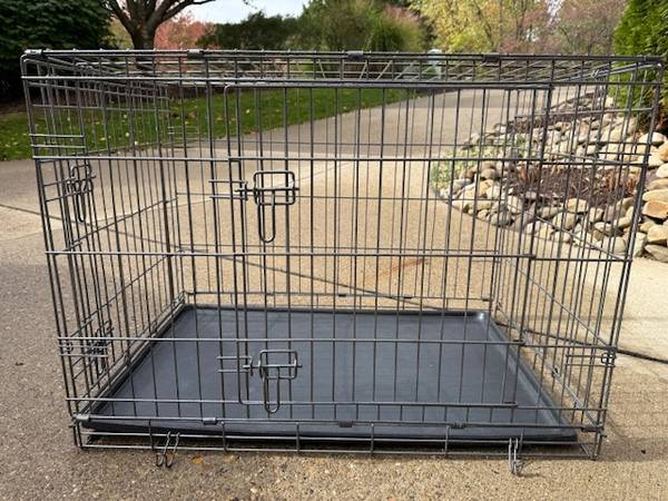 Large, very sturdy, metal dog crate with floor tray. Easily folds up (no pins). It has two entry doors with two latches, one on short side, and one on long side. Dimensions are L-36", W-23",...