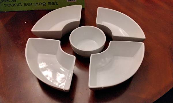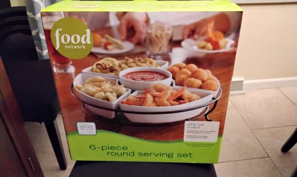 Food Network 6 piece round serving set New 15 inches round porcelain dishes dishwasher safe, microwave safe wrought iron base