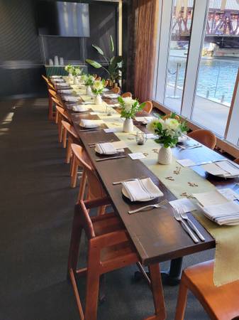 Table runner, used once at rehearsal dinner. Sage green burlap with 1/2" fringed edge. Super long, perfect for family event where multiple tables used end-to-end. 10"wide x 252"long!! See photo, it's impressive. You could probably cut into multiple runners and fringe the edges of each, or even make placemats. $20, cash please. The white vases in the photo are posted also.