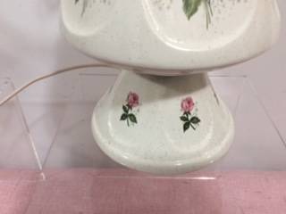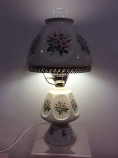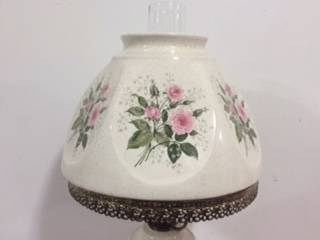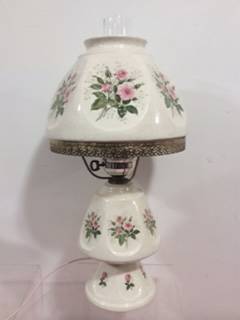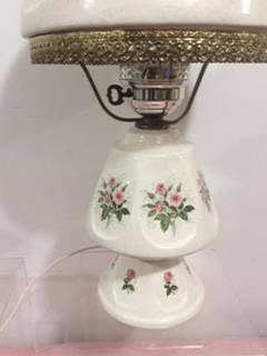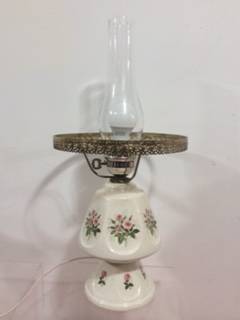 Vintage Ceramic Hurricane Lamp aka Parlor Lamp is fired in a speckled off-white shade and with a rose bouquet motif. Measures 22”H x 10”W. Accented with faux brass hardware. Side switch operation with a generous 80” cord. Includes clear glass chimney. No chips, cracks or crazing. Beautiful, unique piece. Photos are part of the description. If posted, item is available. Cash only. To purchase, choose a location from the list below and suggest a meeting day/time: