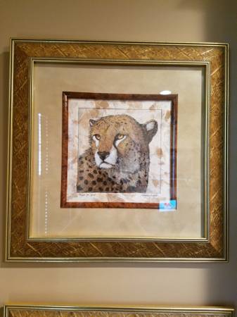 Two framed Wild Cats by award winning local artist Thomas Hirata. The Cheetah is titled "Built for Speed". The Leopard is titled "Dangerous Spots". Each is 15 1/2 x 15 1/2 square. We had them hung in a grouping with a Tiger in a separate post. We paid $180 each, selling the pair for $80, cash please. Reasonable offers considered.
