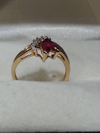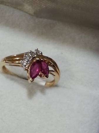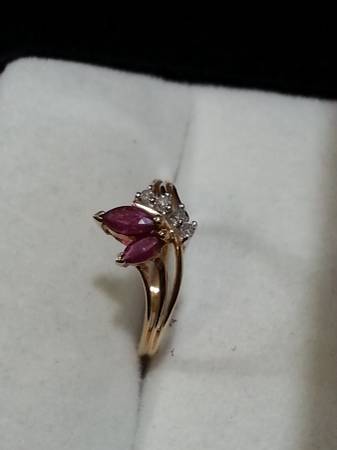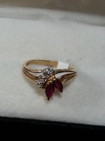 New 14k yellow gold diamond and ruby. Ring has 2 ruby's approx. 1/4ct each with four small very clear diamond. its a size 6 and weighs 2.2 grams. comes with new ring box.