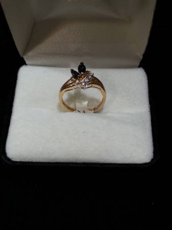 New 14k yellow gold diamond and sapphire ring, it has 2 approx. 1/4 ct sapphires with 4 small very clear diamonds. it is a size 6 and weighs 2.2 grams comes with new ring box.