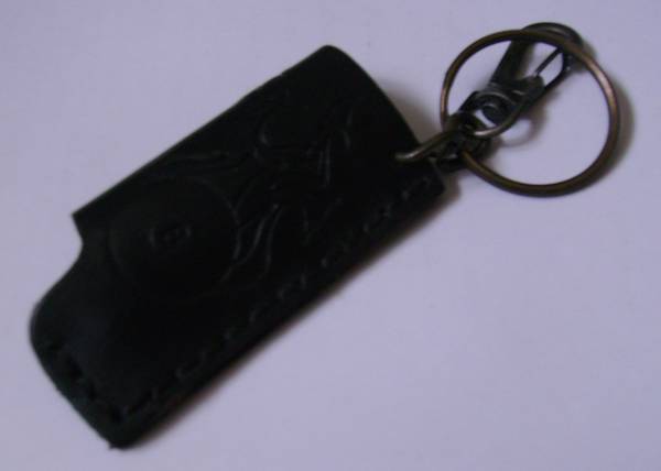 Black leather lighter holder with key chain and metal ring. Flaming 8 ball etched in leather Holds Bic or Scripto lighters